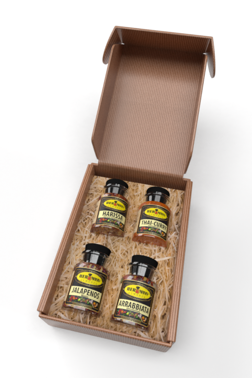 Für alle Gourmets, die es gerne kräftig würzig oder scharf mögen: neben unseren hauseigenen Gewürzmischungen Harissa und Arrabbiata enthält das Set Jalapenos für Chili Liebhaber sowie Thai Curry für die scharfen Klassiker der asiatischen Küche.